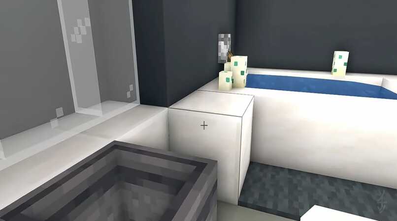 De igual forma, máquinas como la bañera de hidromasaje o la ducha de lluvia, y elementos como las toallas, alfombras y cortinas de ducha, también pueden agregar una sensación de lujo a tu baño moderno en Minecraft.